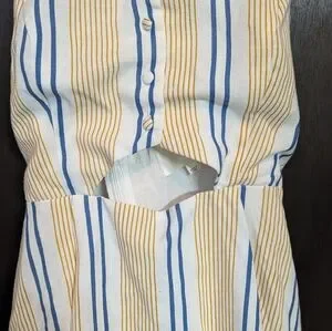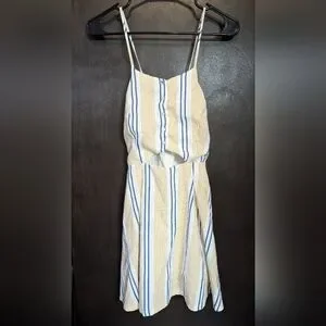 Chic sleeveless cutout dress with blue and cream stripes. Perfect for casual outings. In very good pre-owned condition.