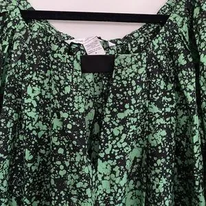Oversized paint splatter print in black and green with billowy sleeves with elasticized cuffs, contrast black hem, keyhole cutout with black contrast at top.