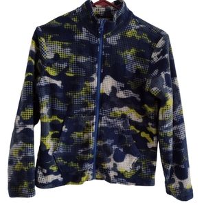 Kids Boys Girls Eddie Bauer Fleece Full zip jacket. Size M 10-12. Preloved but in excellent condition. Blue, neon green, and white camo style. Fleece type material.