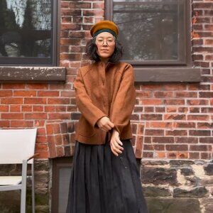 This jacket is unlined. The buttons are handcrafted British made corozo nut. Auburn is an exclusive colour to MamaOwl. The last pictures are screenshots of Erica from ahistoryofarchitecture, wearing the jacket.