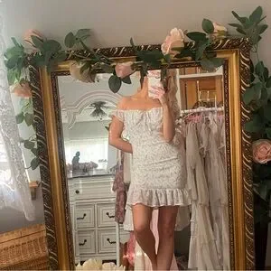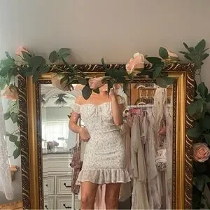 This charming cream sundress features a playful tiered design with ruffled details and off-the-shoulder puff sleeves. The mini length adds a flirty touch, making it perfect for a wedding guest or a night out.