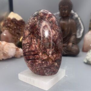 Beautiful Black Cherry Moonstone - polished stone freeform with intricate smoky quartz patterns. Perfect for home decor or meditation spaces.