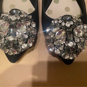 These Boden black flats feature a striking pointed-toe design adorned with a dazzling cluster of sparkling crystals. The elegant embellishment creates a beautiful contrast against the sleek black base, making them perfect for formal occasions.