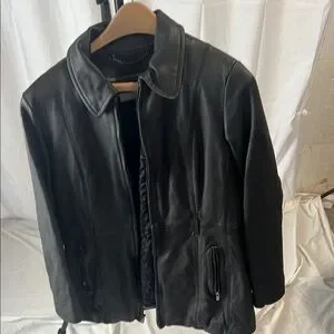 This black leather jacket from Wilsons Leather features a classic design with a smooth glossy finish. It has a structured appearance with defined shoulders and a front zipper closure, making it a versatile piece suitable for various occasions.