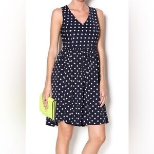 Chic navy dress featuring classic cream polka dots. Perfect for any occasion. Lined with hidden pockets.