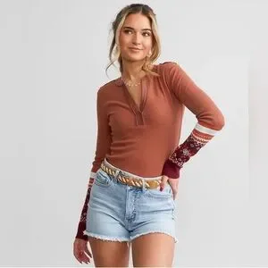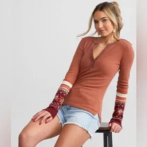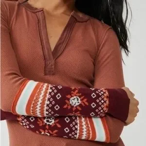 NWT We The Free Free People Mikah Layering Cuff Autumn Combo Top Long Sleeve Shirt. Size XS. Boho, bohemian, casual, comfy, comfortable, thermal, cuff design, 70s, 80s, western, maroon, rust orange, winter, fall, spring. Please ask all questions prior to purchasing so there is no confusion! Make me an offer😊