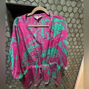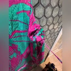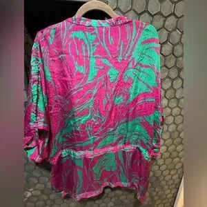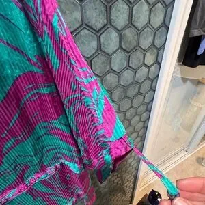 Gorgeous silk blouse in a vibrant tropical print. Adjustable sleeve length and waist can be cinched. Makes for a great top or beach cover up for your next vacation or for the summer. Lightweight and comfortable!