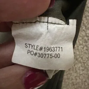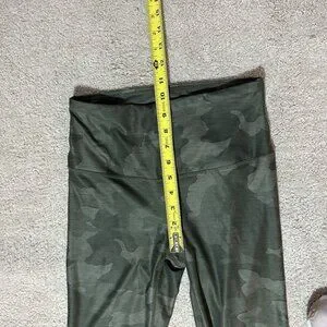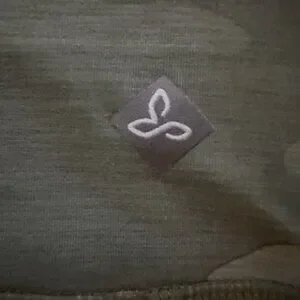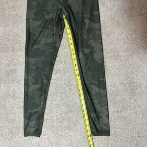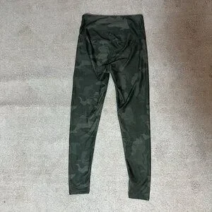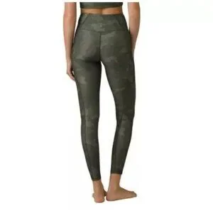 PrAna Electa green camo leggings in women’s size small. Feature a high rise, back hidden pocket. Made for yoga. Shiny nylon and spandex blend material. Really cute. Materials tag missing. Material info from website.
