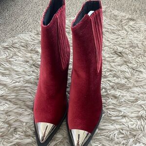 These striking burgundy velvet western heeled boots feature a pointed toe adorned with a metallic silver cap, creating a bold contrast. The “Lochlan” design includes elastic gore side panels for easy slip-on, while the western block angled heel provides both style and comfort. Perfect for elevating any outfit, these ankle boots are a must-have addition to your footwear collection. Textile Upper (Velvet). 4” Heel. 5” Shaft (approximately). Man made lining. Cushioned footbed. TPU outsole. Size 10 M. True to size. Open to offers. Quick Ship.