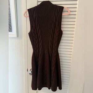 The Charade Dress is a mini length cable knit dress with a mock neck and full skirt.