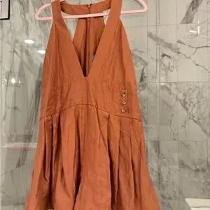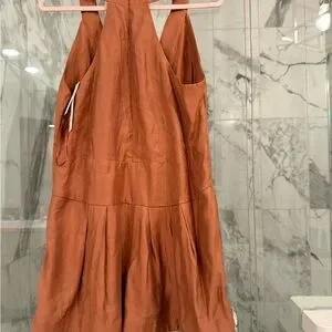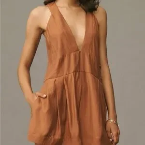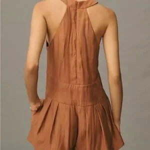 This stunning jumpsuit features a rich brown and red color scheme with elegant pleats that enhance its flowy silhouette. The sleeveless design and deep plunge neckline make it an ideal choice for cocktail events or a night out. Perfectly combining style and comfort, this piece is a must-have for your wardrobe.