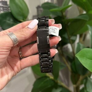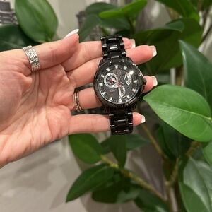 Old world inspiration meets new world technology in this sporty retrograde perpetual calendar with alarm unlike any other. This stainless steel black ion plated watch with carbon fiber dial ring features dual time, month-day-date, 12/24 hour time, non-reflective crystal, 42mm screw-back case, 100M WR & fold over clasp with hidden double push button.