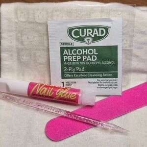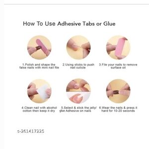 With adhesive tabs, it is highly recommended that you file/buff your nail beds so that they're a little rough. Once you apply the jelly tab to the fake nail (you can also add glue with tabs for longer wear) and press onto your nail bed, do not wash hands or get wet for at least one hour, while periodically pressing on nails to ensure a strong hold to your real nails. Once nails have set and pressed for at least one hour, they can be washed, trimmed, and filed to style.