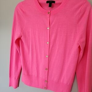 This like new J. Crew cardigan sweater for women in size Medium features a button front design and is made of 100% merino wool in a bright pink color with gold buttons. It has a round neckline, long sleeves, and a tight-knit style.
