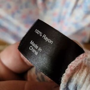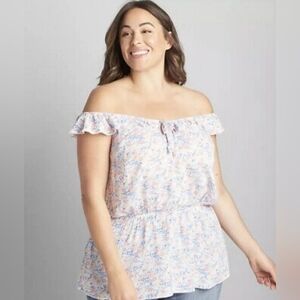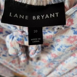 Lane Bryant Floral Sleeveless Off Shoulder Ruffle Tank. This is more appropriately sized at a 22 / 24, womens 2x - 3x. It's marked a 20 but it is too big to be accurate. Has a lot of stretch to it, very forgiving and flattering shape. Nice and light for summer.