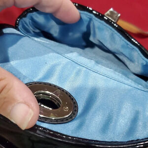 shiny black patent leather blue interior could use more cleaning but in very good used condition embossed c twist lock front zip center removable shoulder crossbody strap in tan handles in tan and hardware in silver back pocket also has original hang tag all by coach