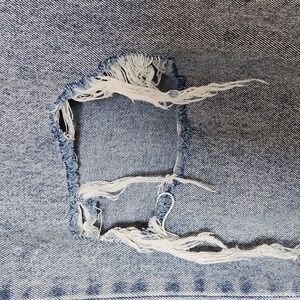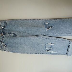 These light blue boyfriend jeans offer a relaxed fit with a high-waisted design and straight Baggy leg cut. The denim features a classic light wash with distressing, including a noticeable rip on the knees, enhancing their casual style. Chain not included, but easily replaced