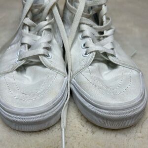 Stylish Vans high-top sneakers. Classic white design. Perfect for casual wear. Good used condition. Recently washed. True to women’s size 7. Bundle and save, offers welcome.