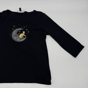 KAREN SCOTT Womens Shiny Cat Moon Shirt Size M Black 3/4 Sleeve Catlady Jersey