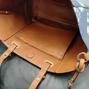2 -20" handles ,magnetic closure,1 exterior zipper pocket ,1 interior side pocket, interior is open with no dividers,1 coin purse, handles & interior is camel brown, base has 4 metal feet, man made material ,11" deep,17" wide 4" thick,like new condition, never used
