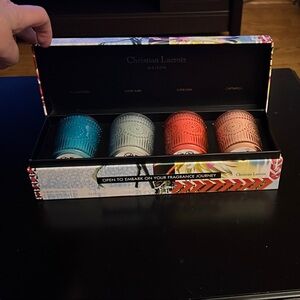 This is a Christian Lacroix set of 4 Luxury Soy Blend Candles. Each glass holder includes a 2.5 oz candle. The scents included are called Enchantress, Angel Aura, Supernova and Captivation. They are new in box, never burned.