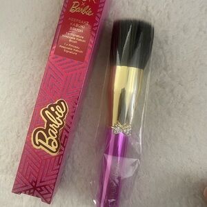 Stylish kabuki brush with Barbie branding. Features vibrant pink and elegant gold accents. Perfect for makeup application.
