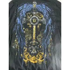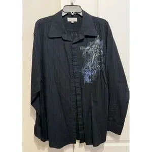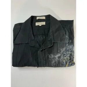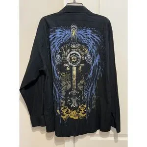 This pre-owned Eighty Eight shirt for men in size XXL features a black color with a graphic cross print, making it suitable for casual wear. It has a collared neckline, long sleeves, and button closure, crafted from lightweight cotton knit fabric. The shirt showcases a punk, gothic theme with accents of buttons and a skull design, perfect for those interested in mall goth, vampirecore, or emo styles. Ideal for all seasons, this button-up shirt offers a regular fit and is machine washable for convenience.