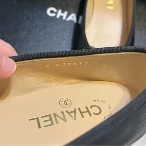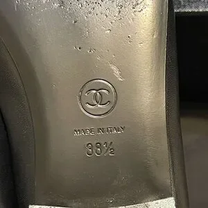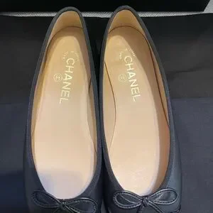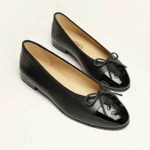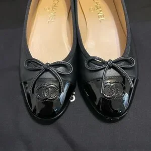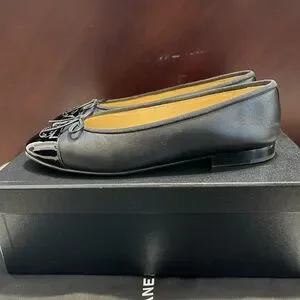 Women’s Chanel Lambskin leather and Patent Calfskin black ballerina ballet flats in very good pre-owned condition! Only worn a handful of times, love these but really needed to get a half size bigger.