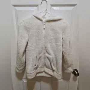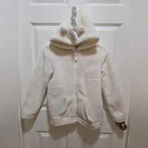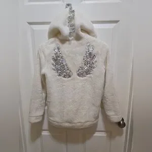 Cat & Jax White faux fur fleece coat with full front zipper and two side pockets. Multicolor sequin wings on the back with a sequins ruffle trim up back the back of the hood with a small sequin unicorn horn and ears kids size L 10/12