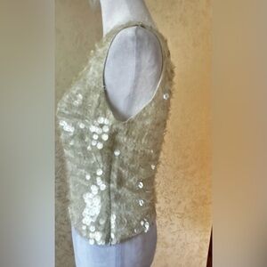 This stunning tank top features a fitted silhouette adorned with shimmering sequins that create a captivating texture. The rounded neckline and sleeveless design make it a versatile choice for various occasions, while the elegant cascading effect of the sequins adds a touch of sophistication. Clips for bra. Zipper on the side