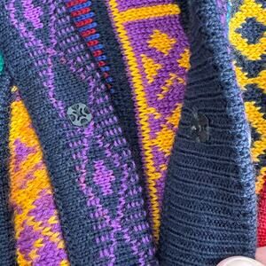 Emaroo Australia 3D wool knit cardigan. Pure new wool. Multicolor, multi pattern sweater. Button front. Heavy weight sweater. Some faint stains - see photos. Some loose stitching - see photos. Still a great piece!!
