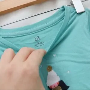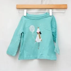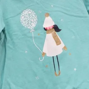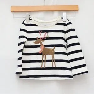 Adorable children's tops with playful designs. Includes teal top with a whimsical print and a striped top with a reindeer motif. Perfect for casual wear.