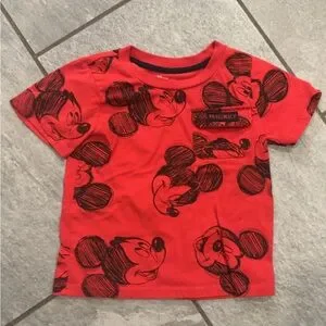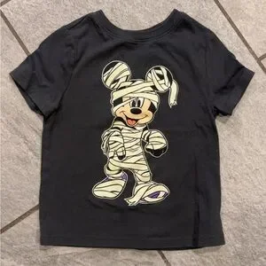 Bundle of 5 tee shirts for toddler boys in 3T/3Y. White shirt is Shein, red Mickey shirt is Disney, Mickey mummy shirt is Old Navy, Spiderman shirt is H&M, and black shirt is Rabbit Skins.