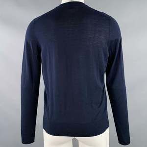 in a navy merino wool knit featuring long sleeves and V-neck. Made in Italy.Excellent Pre-Owned Condition.
