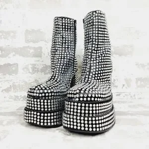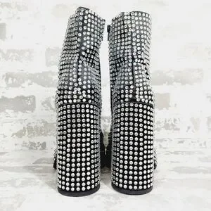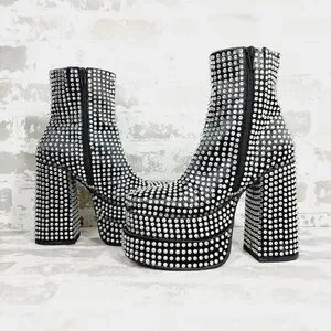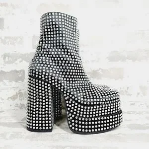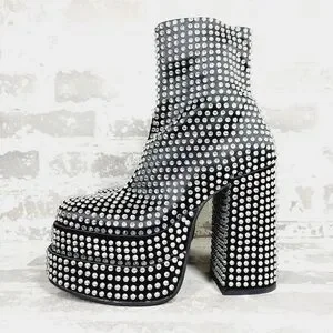 Elevate your style with these stunning studded black platform ankle boots. Perfect for making a bold fashion statement.