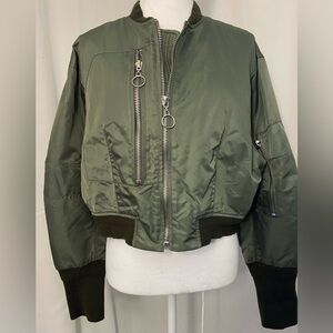 NWT Fate Army Green Zip Up Cropped Bomber Jacket With Ribbed Cuffs And Neckline And Waist Size Large