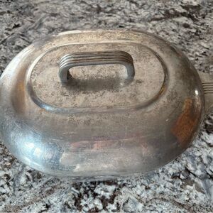 This silver cookware casserole dish features a rounded shape and a flat bottom, making it ideal for various cooking tasks. The domed lid includes a convenient handle for easy lifting, and the aluminum construction ensures even heat distribution. Its well-used appearance adds character to your kitchen essentials.