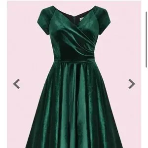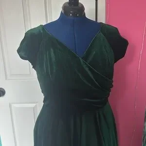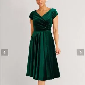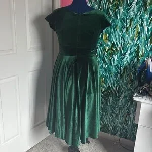 Expertly crafted from our luxury stretch velvet in Forest Green, this dress features a wrap style bodice, full circle skirt with pockets and a cap sleeve.