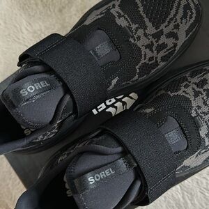 Brand New Sorel Explorer Blitz sneaker in black abstract camouflage Mens size 10.5 cool stripe strap for no lace look. Super comfortable and lightweight :)