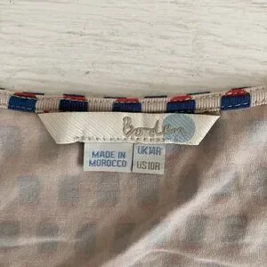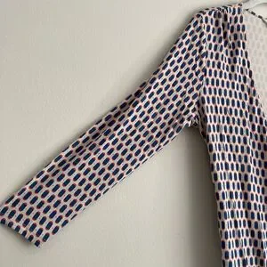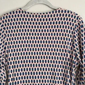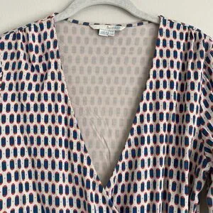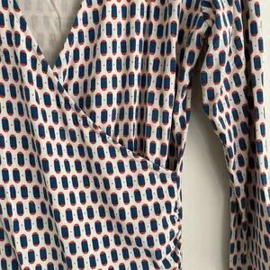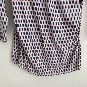 Boden Womens Faux Wrap 3/4 Sleeve Blouse Top Size 10 Multicolor Stretch Business. Boden women's blouse top. Faux wrap with v-neck. 3/4 sleeves. Ruching along both sides. Stretchy viscose and elastane fabric. Beige, blue and red print. Size 10. Measured laying flat: measures 18" from pit to pit, 24.5" from mid tag to end of sleeve, 28.5" long from top of tag to hem.