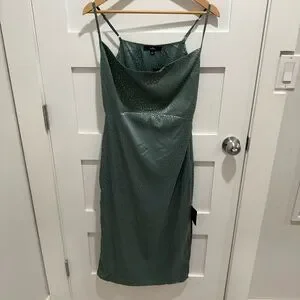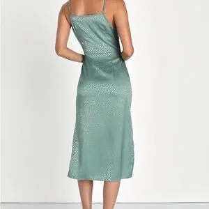 Lulu’s Sage Green Satin Jacquard Cowl Neck Midi Dress.