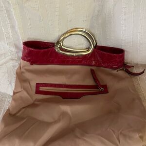 Full size, silver metal handles tote or collapses down various sizes to a fold over clutch. As seen in pictures. Approximately 14 1/2 “ tall, 16 1/2” W, (bottom approx.4” x 15”) Rich deep raspberry! Heavy duty, silver, shiny handles attached by inside screws.