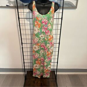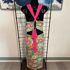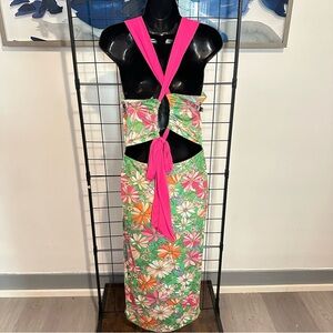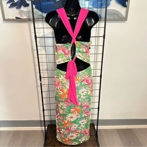 Green floral Stretch dress, Round neckline, Sleeveless, X back, Back cutout, Ribbed, Self tie closure.