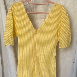 Like new STAUD dress, only worn once. Yellow and white gingham midi dress with puff sleeves, ruched body, and ruffle detail at the hem. You’ll feel like the dancing girl emoji in it!