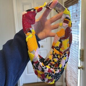 Gray-ish beige backdrop of scarf with orange, red, black, and light pink bead design