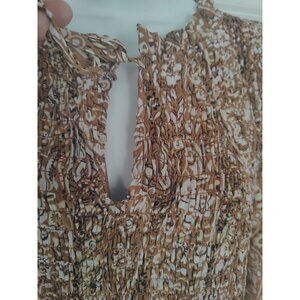 Melloday Brown Floral Tunic Top Peasant Smocked Long sleeve Ruffle Neck S NWT. Polyester. Smocked bodice. Balloon sleeves. Keyhole hole front with tie.