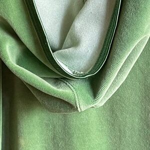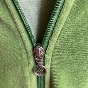 Super soft, zipper front green velour hoodie with satin accents on the front pockets. Size: Women's Large. Gently worn - still in very good shape!