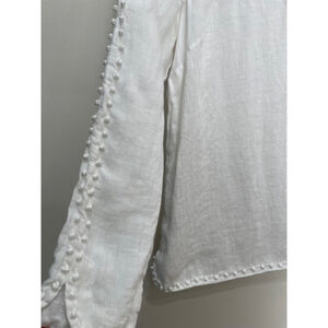 White linen top with long sleeves, round neckline, and decorative embroidered and fringe detail. Made of 100% linen.