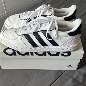 Sleek Adidas sneakers with iconic stripes. Perfect for everyday wear. Worn once, they are slightly too big for me unfortunately.