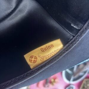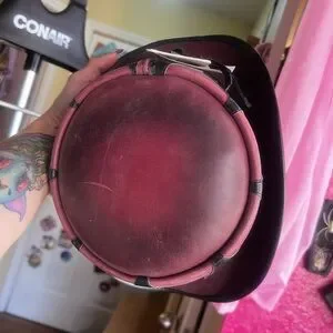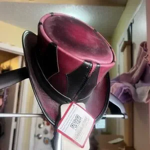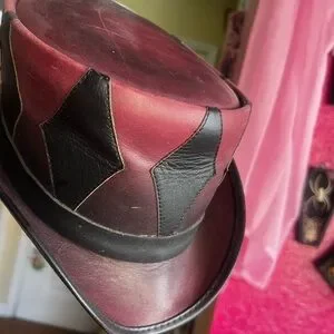 Stylish leather hat with a unique design. Features bold black and pink panels. Perfect for adding flair to any outfit.